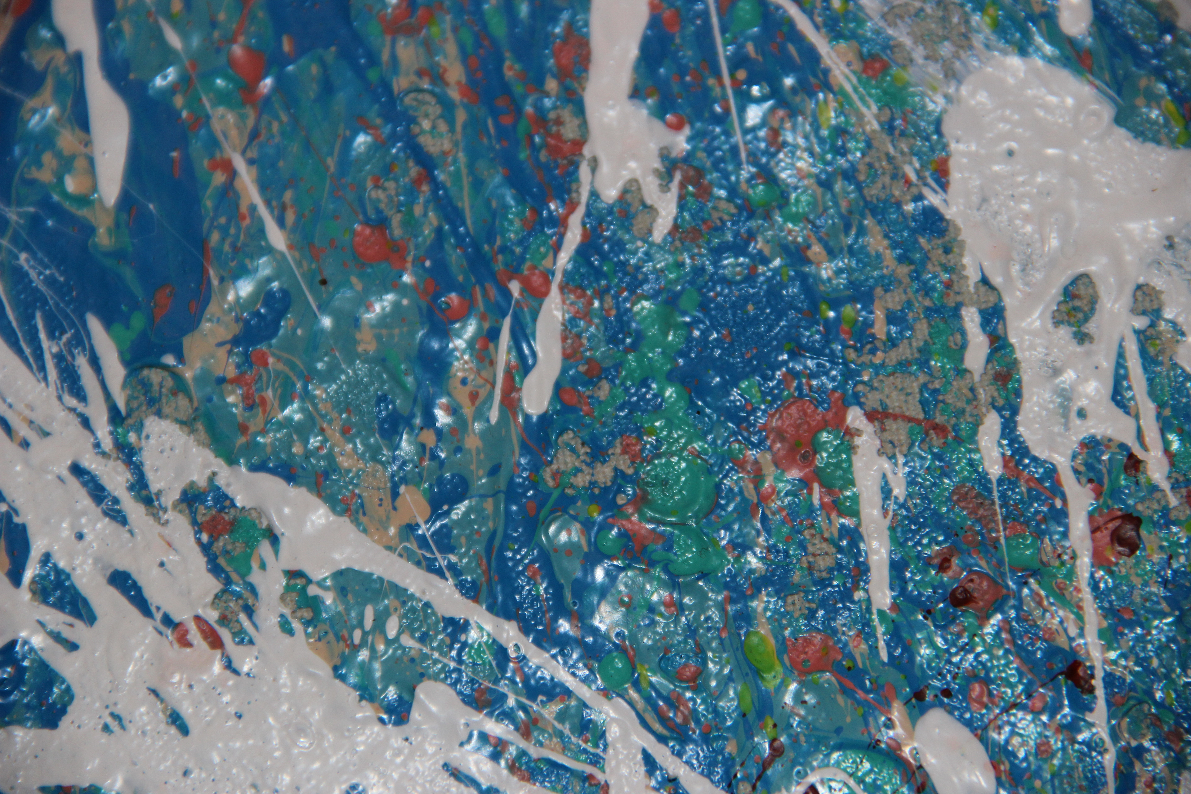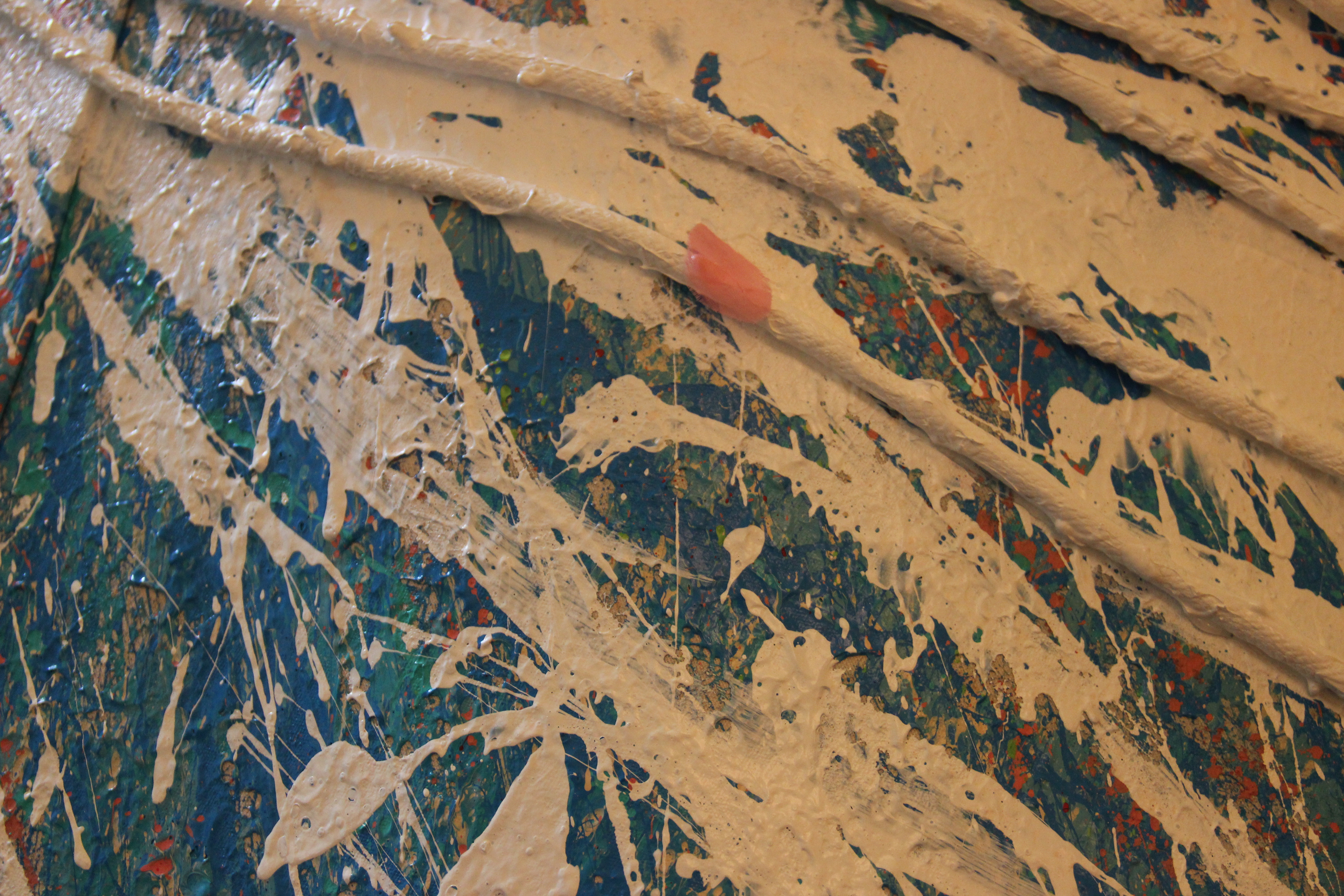 Close-up showing the splatter painted canvas, cording with hot glued surface dipped in acrylic, and chiffon dots